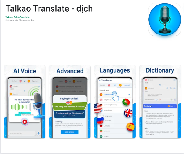 Talkao Translate là ứng dụng dịch bằng giọng nói được ưa chuộng hiện nay, với hệ thống nhận diện giọng nói và dịch đàm thoại, app giúp bạn giao tiếp nhiều ngôn ngữ một cách dễ dàng và chính xác hơn.