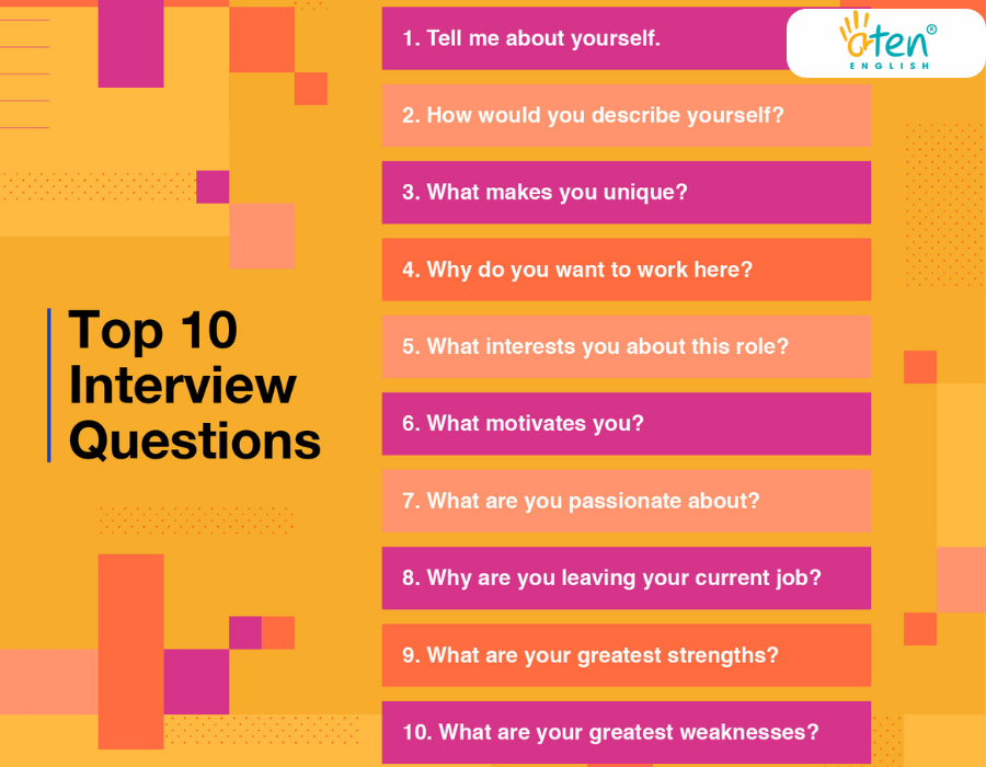 Aten đã giới thiệu cho bạn 15 câu hỏi phỏng vấn tiếng Anh phổ biến và cách trả lời. Nếu bạn thấy hữu ích, hãy chia sẻ với bạn bè nhé!