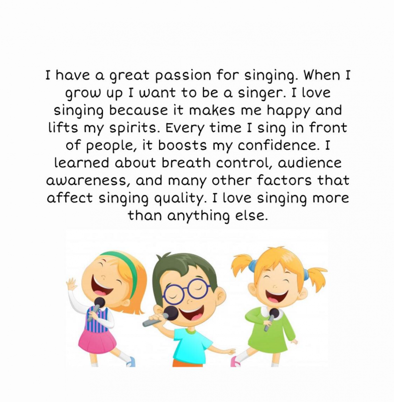 I have a great passion for singing. When I grow up I want to be a singer. I love singing because it makes me happy and lifts my spirits. Every time I sing in front of people, it boosts my confidence. I learned about breath control, audience awareness, and many other factors that affect singing quality. I love singing more than anything else.