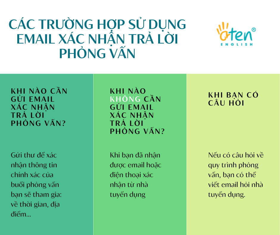 Thời điểm thích hợp để gửi thư điện tử xác nhận phỏng vấn là ngay sau khi nhận được thư mời hoặc cuộc gọi mời phỏng vấn. Nếu sau đó bạn bận chưa trả lời được thì hãy nhớ trả lời càng sớm càng tốt.