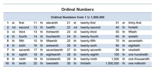 Khi muốn viết số dưới dạng chữ số (giống như số đếm), chỉ cần thêm “th” hoặc “st” ở cuối số thứ tự 1, “nd” ở cuối số thứ tự 2, “rd” ở cuối số thứ tự 3. Ví dụ: