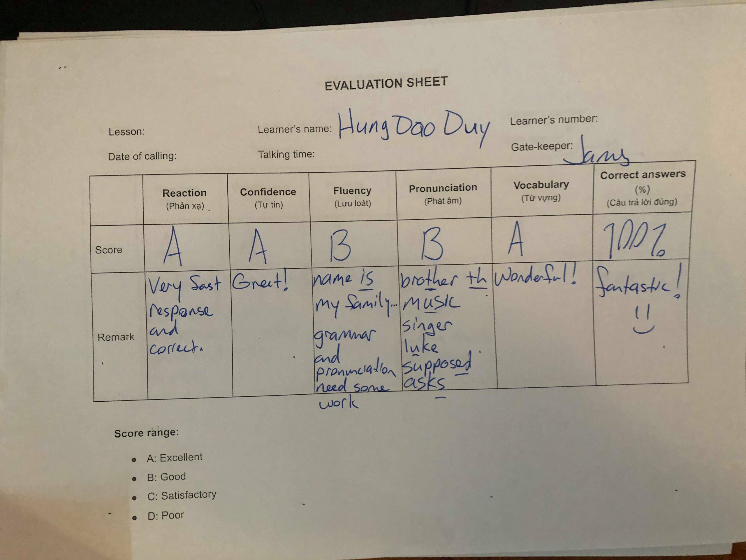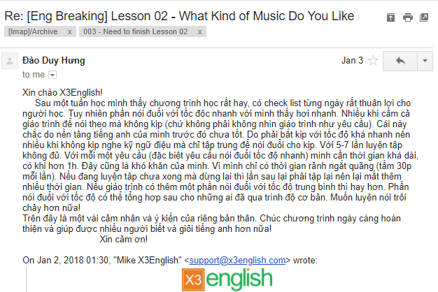 Mặc dù còn một số sai sót, đặc biệt là trong việc phát âm một số âm cụ thể như: brother /ð/ music /ju/ singer /ŋ/ supposed /zd/ asks /s/… nhưng điều quan trọng là Hưng cảm thấy mình đã tiến bộ và có thể phản xạ lại với người bản xứ một cách tự nhiên.