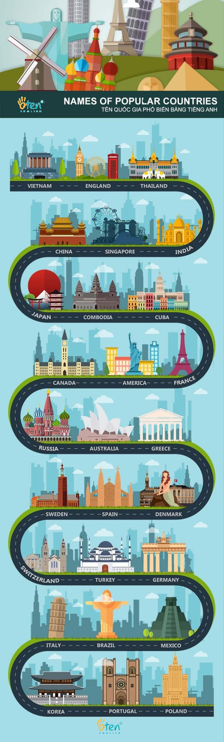 Với số lượng quốc gia khá đa dạng, bài viết này sẽ chỉ tập trung giới thiệu một số tên quốc gia phổ biến, đặc biệt là đối với người Việt Nam.