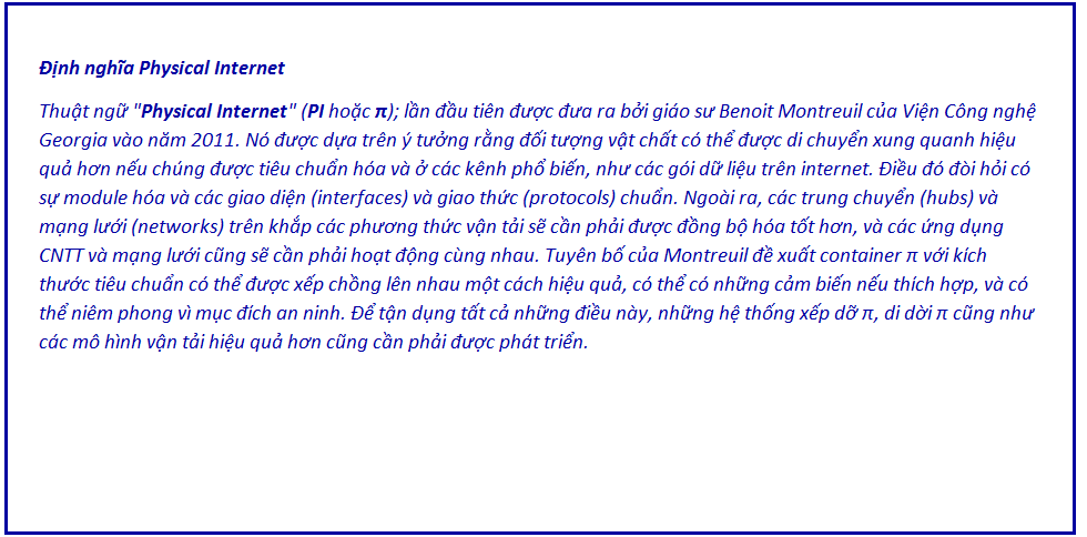 Chia sẻ “Physical Internet” (hay còn gọi là PI): Chủ đề nổi bật trong kịch bản này là sự phát triển của sự hợp tác, cho phép các công ty dẫn đầu thị trường hiện tại có thể duy trì vị thế thống lĩnh của họ. Điều này có thể thể hiện thông qua việc sử dụng nhiều hơn các giải pháp “Physical Internet” (hoặc ‘PI’), dựa trên xu hướng chuẩn hóa kích thước lô hàng, ghi nhãn và quy trình vận hành.