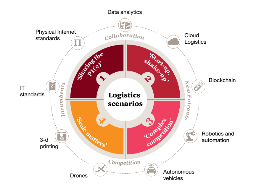 PwC đã cố gắng miêu tả 4 kịch bản có thể xảy ra đối với ngành logistics trong tương lai 5 đến 10 năm tới, nhưng đã giới thiệu qua ở phần đầu, đó là: chia sẻ PI, làn sóng khởi nghiệp, vấn đề quy mô và cạnh tranh phức tạp.
