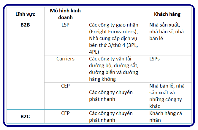 Có nhiều mô hình kinh doanh khác nhau trong lĩnh vực logistics, đôi khi chúng có thể trùng lặp, và mỗi công ty có thể hoạt động theo nhiều hơn một mô hình. Trong bài viết này, chúng ta sẽ xem xét các nhà cung cấp dịch vụ logistics (Logistics Service Providers – LSP), hãng vận chuyển/hàng hải (carrier), và các công ty giao hàng nhanh (Courier/Express/Parcel – CEP), cũng như các doanh nghiệp khai thác bưu điện, trong bối cảnh của lĩnh vực logistics và CEP.