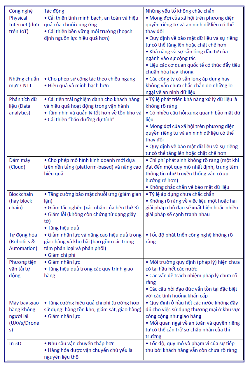 Những tiến bộ trong công nghệ đã đóng góp một phần quan trọng vào quá trình tự động hóa này. Bảng dưới đây mô tả những ảnh hưởng và sự không chắc chắn của từng loại công nghệ đối với ngành logistics.