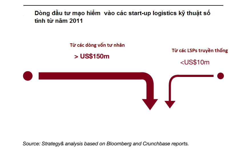 Các công ty logistics truyền thống phải làm gì để đối phó với sự phát triển này? Họ nhận ra rằng họ cần tìm kiếm cơ hội cho sản phẩm và dịch vụ mới – một lĩnh vực mà các doanh nghiệp khởi nghiệp thường có ưu thế. Tuy nhiên, đầu tư của các công ty logistics truyền thống vào các doanh nghiệp khởi nghiệp logistics số chỉ chiếm khoảng 6% tổng dòng vốn liên doanh (dưới $10 triệu) – Xem hình dưới